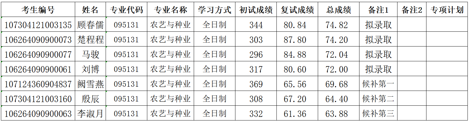 根据四川农业大学《2024年招收攻读硕士学位研究生复试、调剂、录取工作办法》(校研发〔2024〕10号)的文件精神,根据调剂招生计划和考生成绩,农艺与种业专业调剂招生按总成绩从高到低依次确定拟录取名单和候补名单,公示如下: