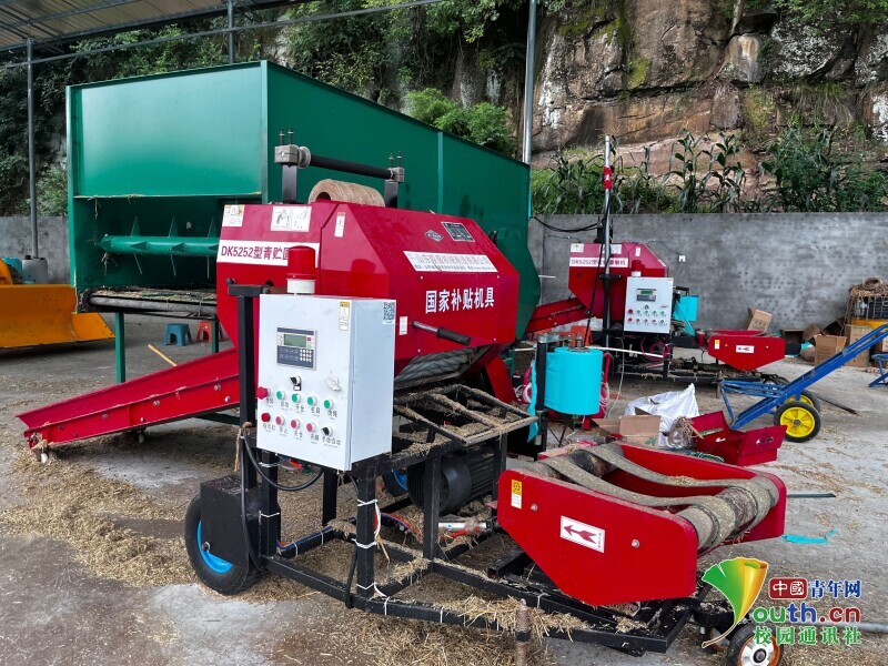 图为制作青贮用到的机器。左边绿色的机器用来粉碎和发酵草料,右边红色的机器可以制作果苞青贮。 中国青年网通讯员 崔雅婕 提供