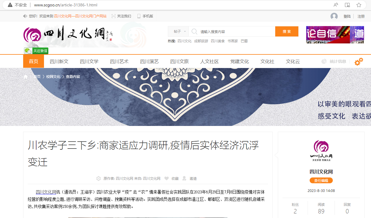 四川农业大学“疫”去“农”情来暑假社会实践团队在2023年6月29日至7月8日围绕疫情对实体经营的影响程度立题,进行调研采访、问卷调查、搜集资料等活动。实践团成员选择在成都市温江区、郫都区、双流区进行随机店铺采访,共收集采访案例150余例,为团队探讨课题提供有效帮助。