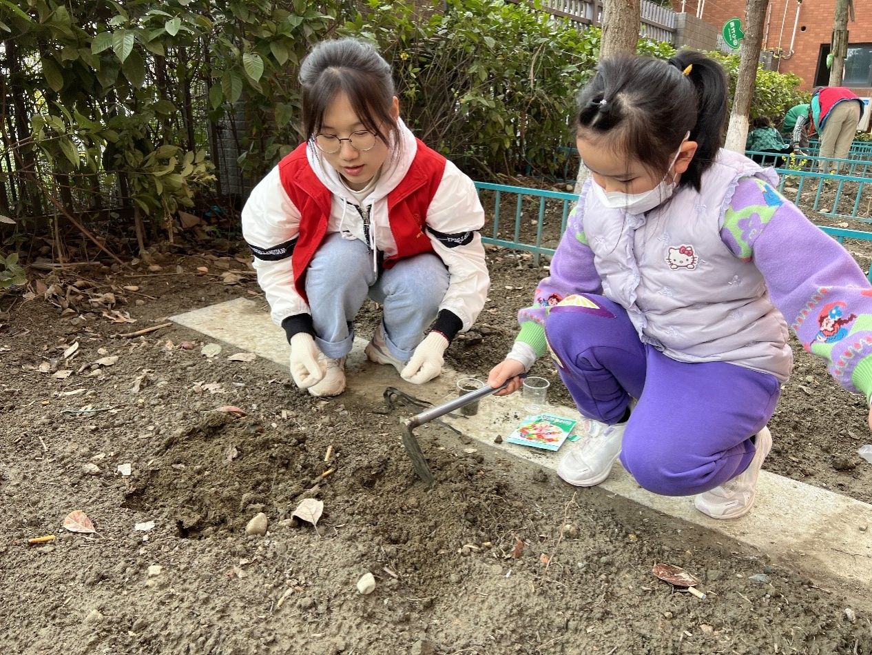 实践与志愿特聘导师陈德炜同学指导大家进行育苗。志愿者帮助小朋友挖土,小朋友将种子种进各自的纸杯里,并将完成育苗的纸杯带回班级,邀请全班同学一起仔细观察和记录发芽状况。