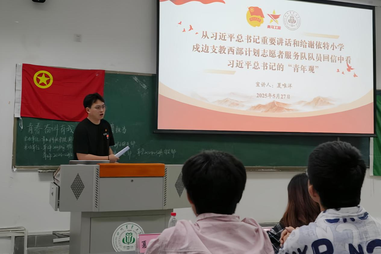 活动在激昂的团歌声中拉开帷幕。学校第十一期青马班学员夏唯洋以习近平总书记的“青年观”为核心,结合习近平总书记给谢依特小学支教志愿者的回信精神,系统阐释了新时代青年的责任与担当。随后,学校第十二届研支团成员何洁结合自身在雷波民族中学的支教经历,生动诠释了“用一年不长的时间做一件终身难忘的事”。她指出,“支教不仅是知识的传递,更是信念的播种”,鼓励在场青年学子坚定理想信念,到祖国最需要的地方书写青春答卷。
