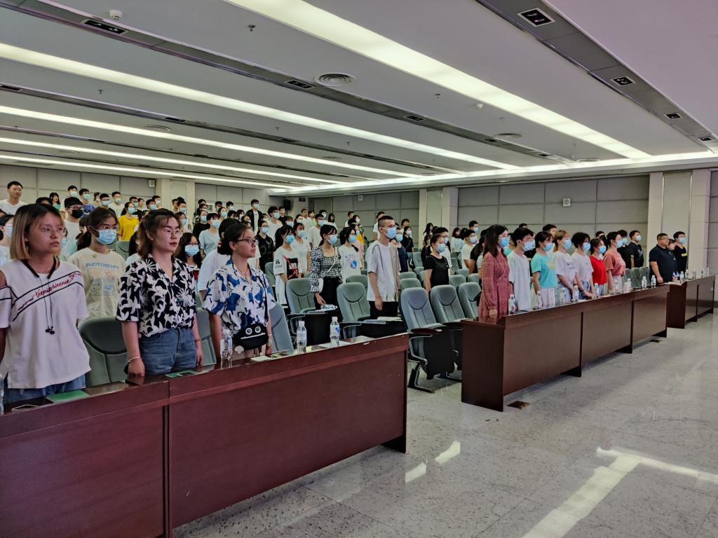 入学教育在雄壮的国歌声中拉开帷幕,全体师生起立齐唱国歌。