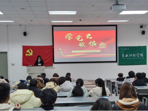 党团学组织主办的“学党史、强信念”主题活动宣讲会在成都校区第四教学楼A区203室举行。活动现场吸引近200余名同学参加。