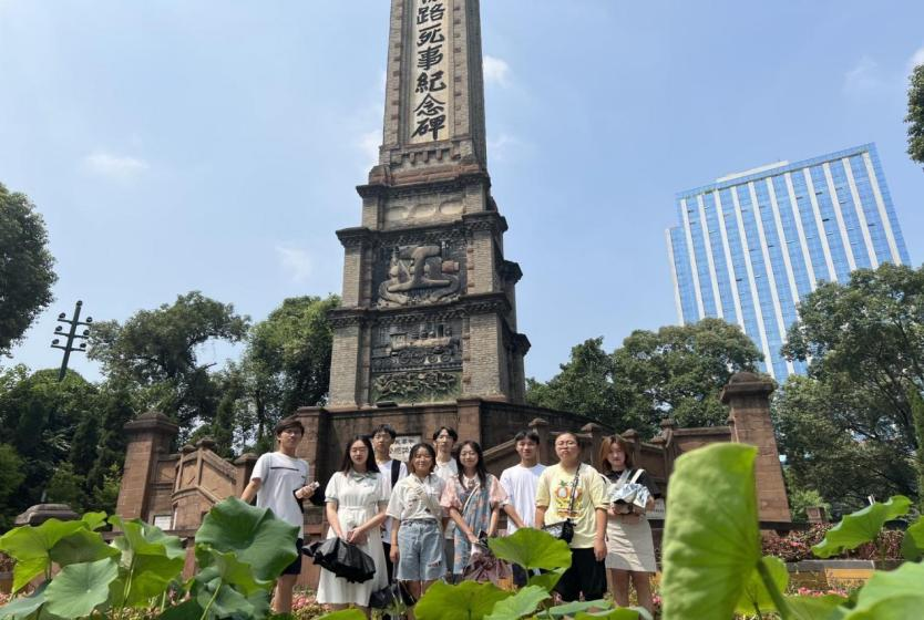 对于具有百年历史的人民公园来说,古建筑自然是少不了的,比如民众教育馆、通俗教育馆、中正图书馆、四川美术家协会旧址等等,在这些古建筑中,最著名的还是位于公园西北角的辛亥秋保路死事纪念碑,它是现在成都唯一留存下来与辛亥革命有关的地标性的碑塔式建筑,具有相当重要的历史意义。辛亥秋保路死事纪念碑建于1913年,碑身呈方锥形,四面均嵌有长条青石,刻有四种书体手书“辛亥秋保路死事纪念碑”十个大字。队员们站在辛亥秋保路死事纪念碑前,心潮澎湃,思绪万千:革命先烈们有的为了民族独立和国家尊严献出了宝贵的生命;有的为了彻底埋葬旧世界,建立社会主义新中国而前赴后继,英勇作战,抛头颅、洒热血;也有的在和平建设时期,为了祖国的繁荣富强而献出青春和热血。全体队员都表达了对先烈的崇敬和怀念之情。