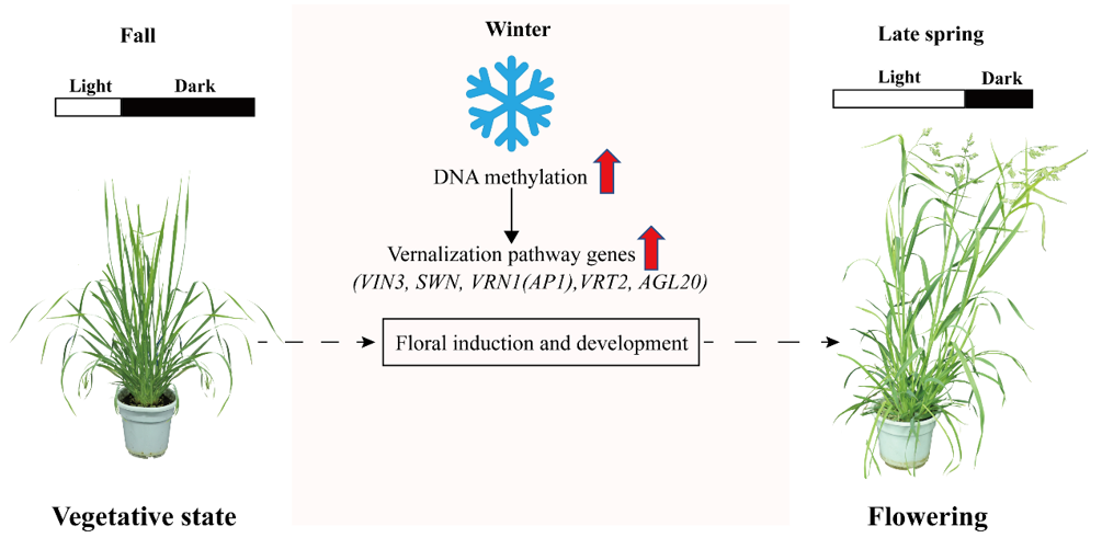 春化作用是植物必须经历一段时间的持续低温才能由营养生长阶段转入生殖生长阶段的一种表观遗传现象,是植物适应温度的季节性波动进化出来的一种机制,以确保在适当的时期开花。春化作用是影响植物物候期和地理分布的重要因素,对于牧草及作物生产具有非常重要的作用。DNA甲基化是一个重要的表观遗传标记,参与植物生长发育、逆境响应等生物学过程。然而,禾本科植物春化过程中DNA甲基化动态变化及其靶基因的调控机理仍知之甚少。