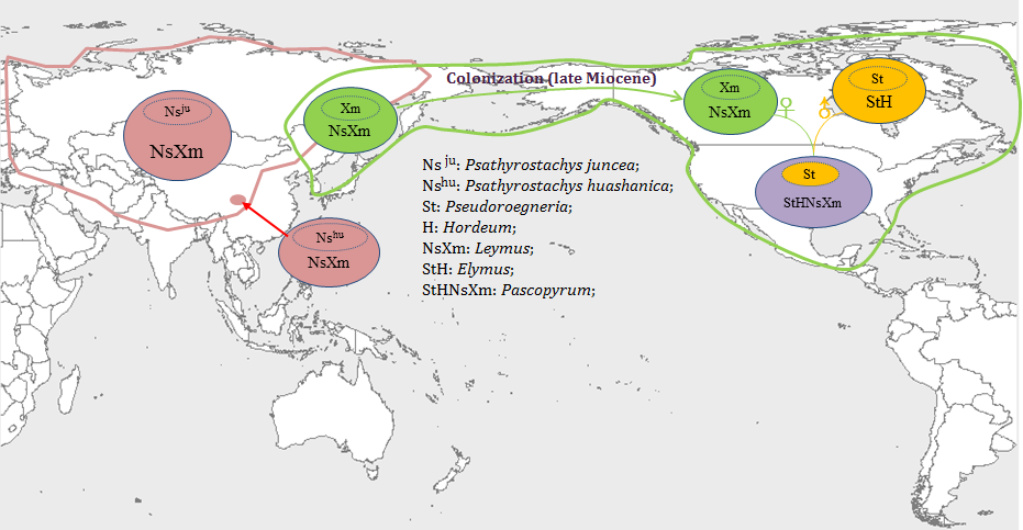 近日,研究小组再次在进化生物学国际传统主流期刊《Molecular Phylogenetics and Evolution》发表研究论文“Evolutionary patterns of plastome resolve multiple origins of the Ns-containing polyploid species in Triticeae”(//doi.org/10.1016/j.ympev.2022.107591)。该研究在全球范围对含NsXm基因组组成的赖草属进行采样,整合116个代表小麦族几乎所有的属分类等级和基因组组成类型的叶绿体基因组变异信息,探讨含Ns基因组多倍体物种的谱系关系,结果表明含Ns基因组多倍体物种形成过程涉及多个母系祖先供体,东亚赖草属祖先于中新世晚期经白令路桥迁徙至北美,并与北美披碱草属植物通过历史杂交形成含StHNsXm基因组物种,由此构成东亚-北美含Ns基因组小麦族间断分布类群。这些新的发现将为赖草属种质资源多样性形成、饲草作物和生态防护草育种过程中的杂交组配奠定基础。该杂志主编邮件留言:“Molecular Phylogenetics and Evolution values your contribution and hope you will consider us again for future submissions”。