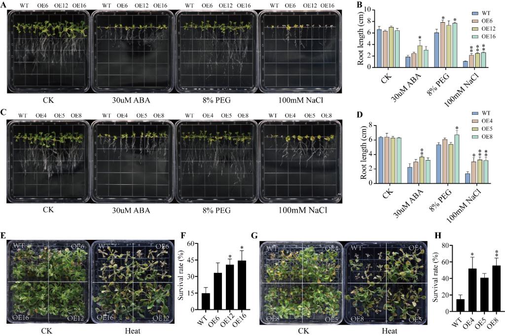 该研究在鸭茅中鉴定到123个MADS-box基因。进化树分析表明,DgMADS基因家族分为两类,M型和MIKC型;共线性分析表明,DgMADS基因家族主要通过串联重复进行扩张。通过对DgMADS基因在逆境胁迫下的表达模式分析,发现DgMADS114和DgMADS115能够显著被PEG、盐胁迫、ABA和热胁迫诱导表达。在拟南芥中异源过表达,发现DgMADS114和DgMADS115能够增强拟南芥在PEG、盐胁迫、ABA和热胁迫下的抗性。对MADS-box家族的全面研究为鸭茅的分子改良提供了科学依据和丰富的基因资源。