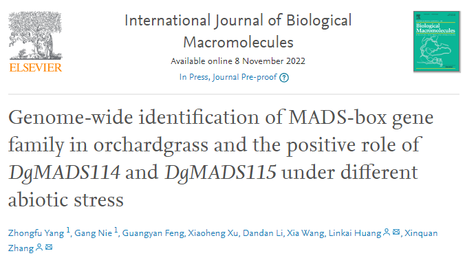 张新全教授团队在中科院1区TOP期刊International Journal of Biological Macromolecules(IF2021=8.025)在线发表了题为“Genome-wide identification ofMADS-boxgene family in orchardgrass and the positive role ofDgMADS114andDgMADS115under different abiotic stress”的研究论文,该论文通过对鸭茅的MADS-box转录因子家族进行全基因组鉴定、表达模式分析和功能鉴定,解析了鸭茅抗逆性强的遗传基础。