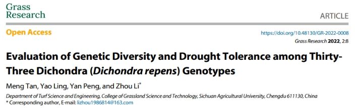 草坪科学与工程系李州团队在评估西南区野生马蹄金种质资源多样性及抗旱潜力研究方面取得新进展。题为“Evaluation of genetic diversity and drought tolerance among thirty-three dichondra (Dichondra repens) genotypes”的论文已发表在由罗格斯大学黄炳茹教授主编的国际优秀期刊《Grass Research》上。
