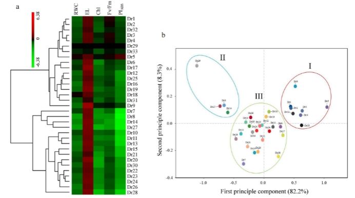 图2 33份马蹄金种质资源基于5种不同生理参数的(a)热图和(b)主成分分析(PCA)