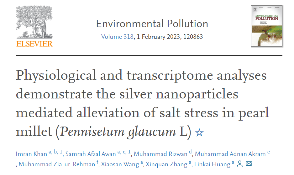 黄琳凯教授团队在中科院大类一区TOP期刊Environmental Pollution(IF2021=10.0)在线发表了题为“Physiological and transcriptome analyses demonstrate the silver nanoparticles mediated alleviation of salt stress in pearl millet (Pennisetum glaucumL)”的研究论文,该论文通过对盐胁迫下美洲狼尾草生理、转录响应研究,解析了纳米银对于美洲狼尾草盐胁迫下改善生长发育的遗传机制,为美洲狼尾草在盐渍地种植及耐盐分子育种提供重要支撑。