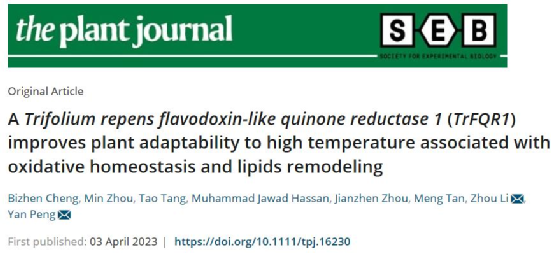彭燕/李州团队在国际著名期刊《The Plant Journal》上发表题为“A Trifolium repensflavodoxin-like quinone reductase 1 (TrFQR1) improves plant adaptability to high temperature associated with oxidative homeostasis and lipids remodeling”的研究论文,揭示了TrFQR1通过调节线粒体电子传递、活性氧稳态和脂质重塑提高冷季型草类植物白三叶(Trifolium repens)耐热性的新机制。