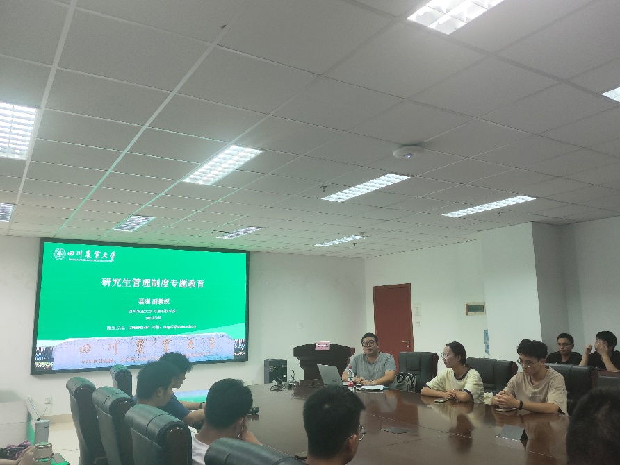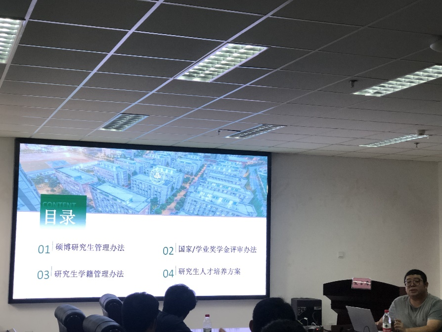 管理实际,围绕研究生培养、管理及授位有关要求进行了讲解,重点对科学道德与学风建设部分做了强调。他希望新同学要加强学术道德和科研诚信建设,严格遵守科研伦理及科研规范,学会研究、善于研究,在科研事业中有所作为,成为一名合格的科学研究工作者。