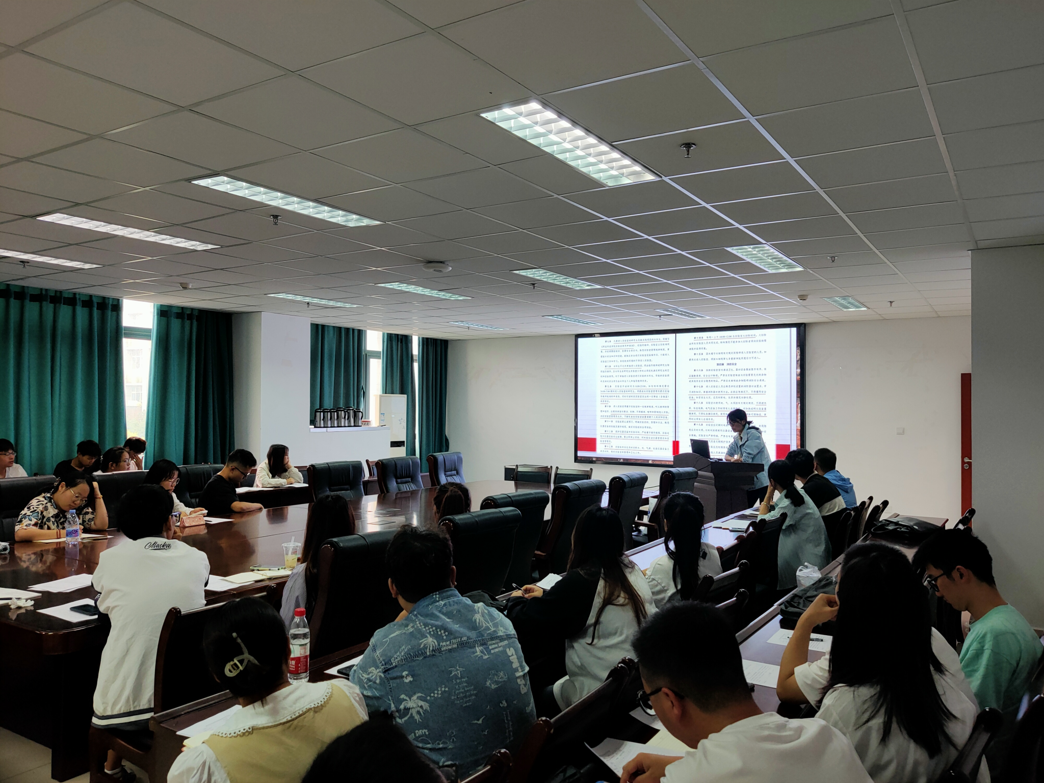 实验室概况和实验室管理规章制度,围绕实验室常见危险源及防护、仪器设备使用注意事项、危化品订购及管理、有毒有害物质使用注意事项及事故发生后的应急处置措施展开培训,着重强调了实验室用水用电基本安全、大型精密仪器使用及保护、易燃易爆物危化品使用及回收注意事项等方面,并提出实验室使用的基本要求和实验过程中需遵守的实验室规章制度。