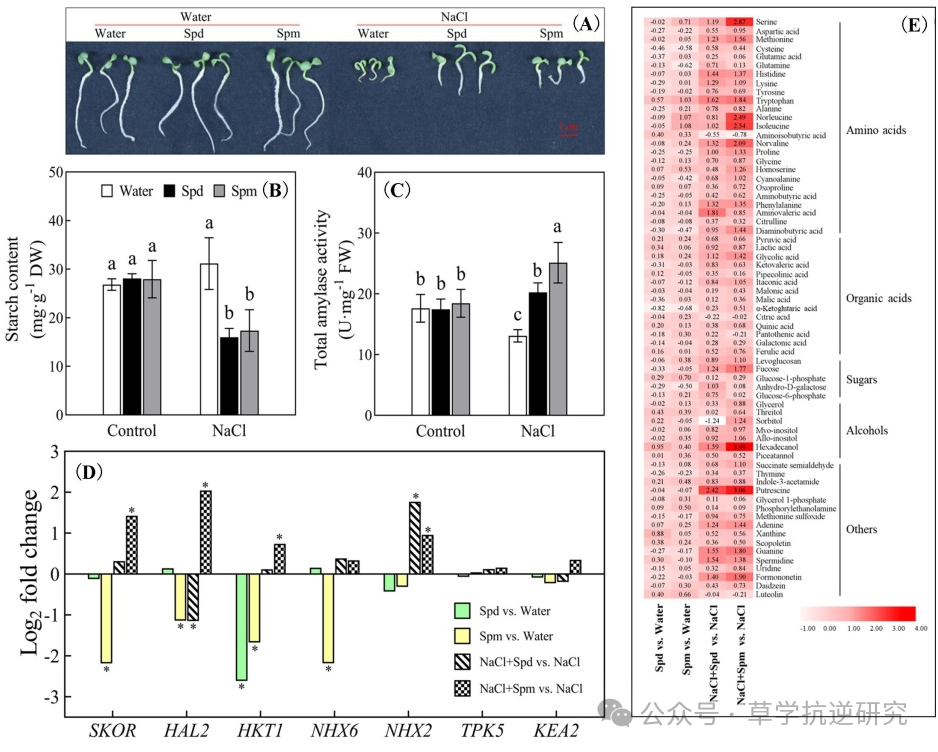 图2亚精胺(Spd)和精胺(Spm)调节有机代谢物积累和离子稳态提高盐胁迫下白三叶种子萌发
