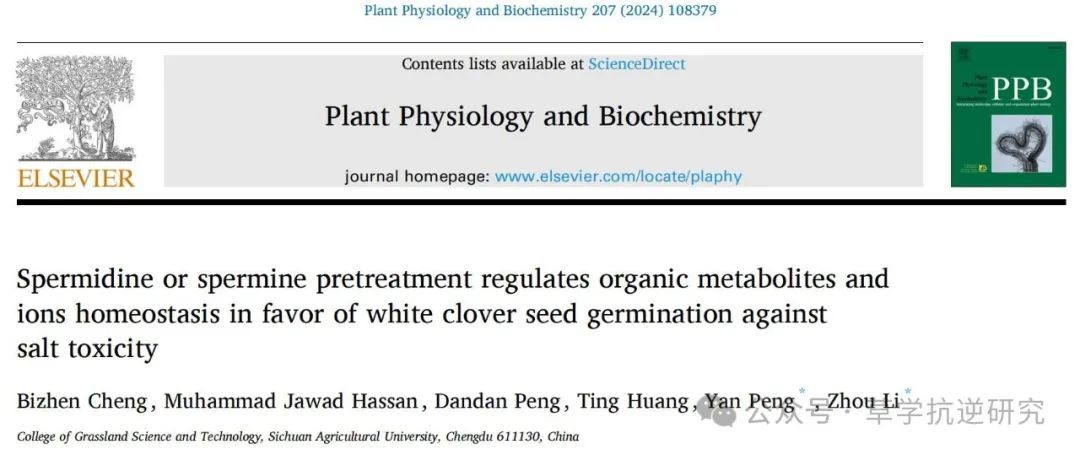 草类植物抗逆研究团队在中科院大类TOP期刊《PlantPhysiologyandBiochemistry》上在线发表了题为“Spermidine or spermine pretreatment regulates organic metabolites and ions homeostasis in favor of white clover seed germination against salt toxicity”的研究论文,揭示了亚精胺(Spd)或精胺(Spm)预处理调节有机代谢物积累和离子稳态提高盐胁迫下白三叶种子萌发的机制。