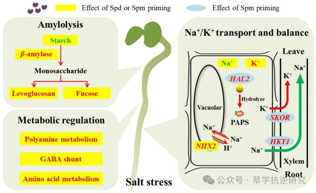 近百年来人们一直探索Spd和Spm提高植物非生物胁迫抗逆性的有益作用,但Spd和Spm参与有机代谢物积累和离子稳态在调节盐胁迫下种子萌发的相关机理尚不清楚。白三叶是一种世界范围内广泛栽培利用的豆科牧草和草坪地被植物,土壤盐碱化降低了其产量和质量。研究发现,Spd或Spm浸种处理显著提高了盐胁迫下种子的发芽率、发芽势、种子活力指数和幼苗生长,这与Spd或Spm激活β-淀粉酶活性从而加速淀粉水解有关。Spd或Spm浸种处理也显著提高了种子萌发过程中多种氨基酸、有机酸、糖和其他代谢产物(腐胺、肌醇、山梨醇、大豆黄素等)的积累,这些代谢物参与增强盐胁迫下种子发芽过程中的渗透调节能力、抗氧化防御和能量供应。此外,Spd或Spm浸种处理不仅显著减少了盐诱导的K+损失和Na+的过度积累,而且提高了K+/Na+比,有助于种子萌发过程中维持Na+和K+平衡。盐胁迫下Spd或Spm浸种处理的种子显著上调了NHX2的转录水平,这与增强Na+从细胞质到液泡的区隔化有关,从而降低了Na+在细胞质中的毒性。