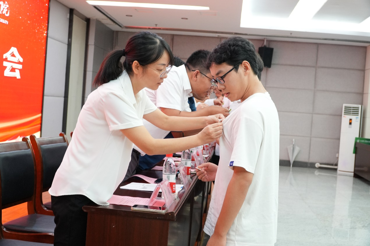 主席台就坐的领导和老师为新生代表佩戴院徽,其余新生全体起立自行佩戴。在这庄重且温馨的时刻,每一枚院徽都蕴含着nba看球