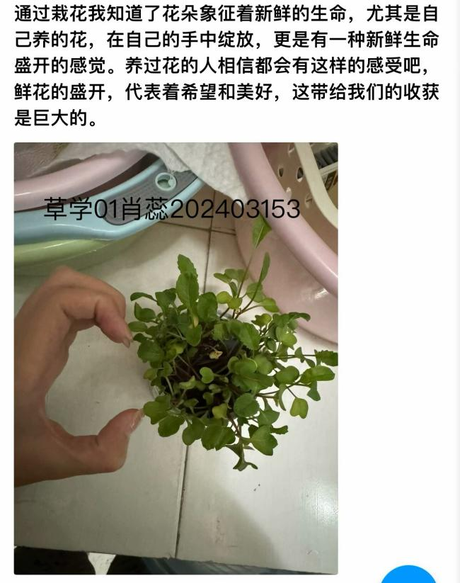 草学202401曹欢同学在种植第22天时这样说道:“这20多天慢慢见证着你的成长,看着你从一颗颗小种子,慢慢长出了芽、根、叶,你的每一次变化都带给我不同的感触,我会因为你的生长感到高兴,也会因为你的枯萎感到担忧,因为自己的粗心感到抱歉,也会因为一些不知道是否正常的生长现象而去网上搜索,总之非常感谢你,你成长的同时我也在成长,正如一分耕耘一分收获。”