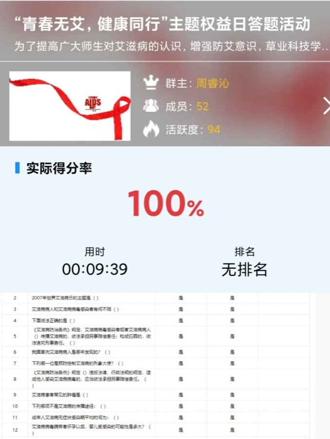 草学202301班的杨启航同学在参与答题后表示:“通过此次活动,我对艾滋病有了更深入的认识,深刻体会到其对患者身心健康的影响以及背后涉及的社会公平正义问题。防艾宣传工作至关重要且任重道远,需要我们每个人积极参与。未来,我希望能为构建无艾世界贡献更多力量。”