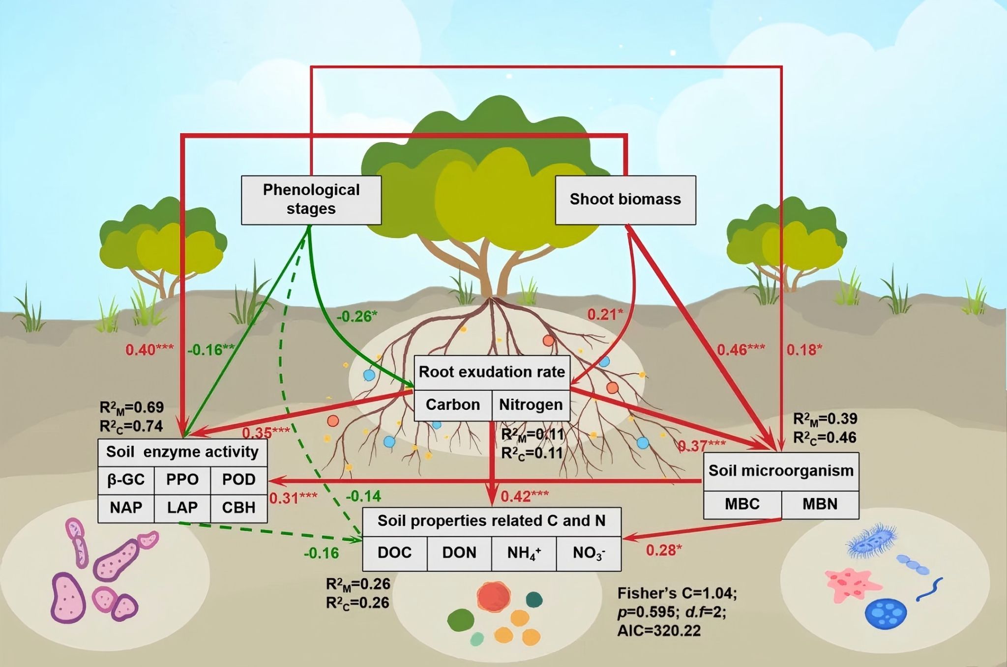图10 杯腺柳根系分泌物过程对根际碳氮特性的直接和间接驱动因素。结构方程模型考虑了物候期、地上生物量、根系分泌速率、微生物生物量和酶活性对土壤碳和氮含量的直接和间接影响