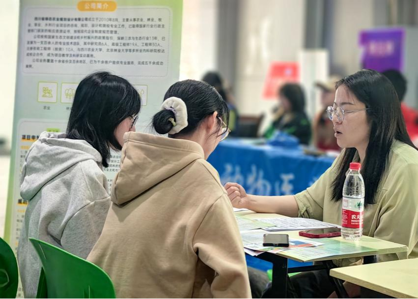 、动物营养研究所共同主办,吸引了正大集团、温氏股份、通威股份、德康集团、川草生态、绿态农业等87家行业领军企业参会,提供岗位需求数百个,覆盖技术研发、生产管理、市场营销、技术服务等全产业链领域,与学校专业设置高度契合。