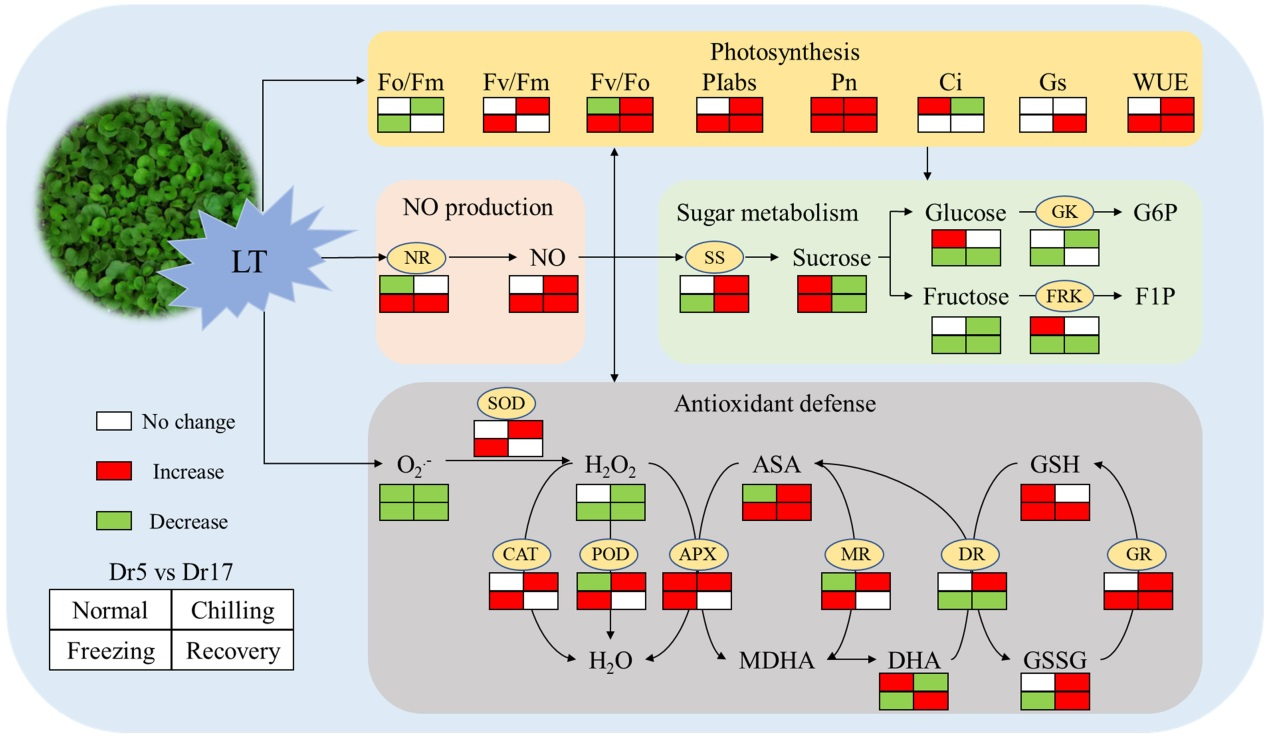 图示: 耐冷性强的马蹄金新品系(Dr5)和冷敏感材料(Dr17)在响应低温胁迫及胁迫后的恢复过程中一氧化氮产生、光合稳定性、糖代谢和抗氧化代谢存在差异。