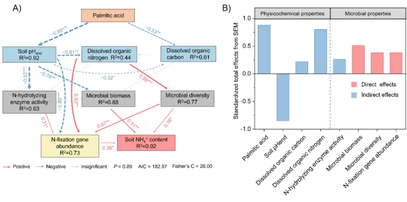 图5土壤化学性质和微生物性质对固氮基因丰度和土壤NH4+-N浓度的影响。(A)结构方程模型显示了棕榈酸对NH4+-N的影响。红色实线表示正相关,蓝色虚线表示负相关,灰色虚线表示不显著相关;箭头旁边的数字是标准化路径系数。(B)化学性质和微生物性质对土壤NH4+-N浓度的标准化总效应