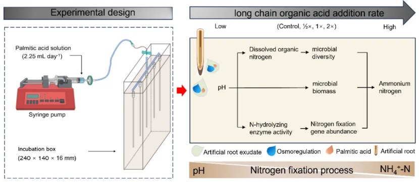 首次证实,在短期培养条件下棕榈酸主要通过降低土壤pH值,触发微生物“固氮开关”,提升土壤NH4+-N浓度。