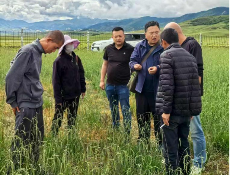 7月30日,专家一行在四川省棕宇生态保护有限公司杨鹏经理、基地技术总监唐智云和生产总监王毅等陪同下,实地考察了位于理塘县濯桑乡的高原牧草种子生产示范基地。该基地面积2000余亩,专家们重点查看了新建的牧草种质资源圃、垂穗披碱草种子生产基地和燕麦饲草生产基地,并就恶性杂草防除、新播披碱草地管理等技术措施对7名基地工人进行了现场培训指导。随后,专家还与理塘县农牧农村和科技局斯郎洛布等工作人员进行座谈,就甘孜州草业科技需求及校地合作进行了深入交流。
