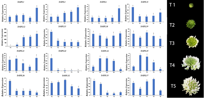 Expression profiles of 16 selected TrSPL genes at 5 different flower development stages in T. repens. T1, Immature inflorescence; T2, Inflorescences in which no floret was open; T3, Inflorescences in which outermost circle of florets were open; T4, Inflorescences in which 50% of florets were open; and T5, Mature inflorescence. The vertical bar is the standard deviation. The letters indicate differences.