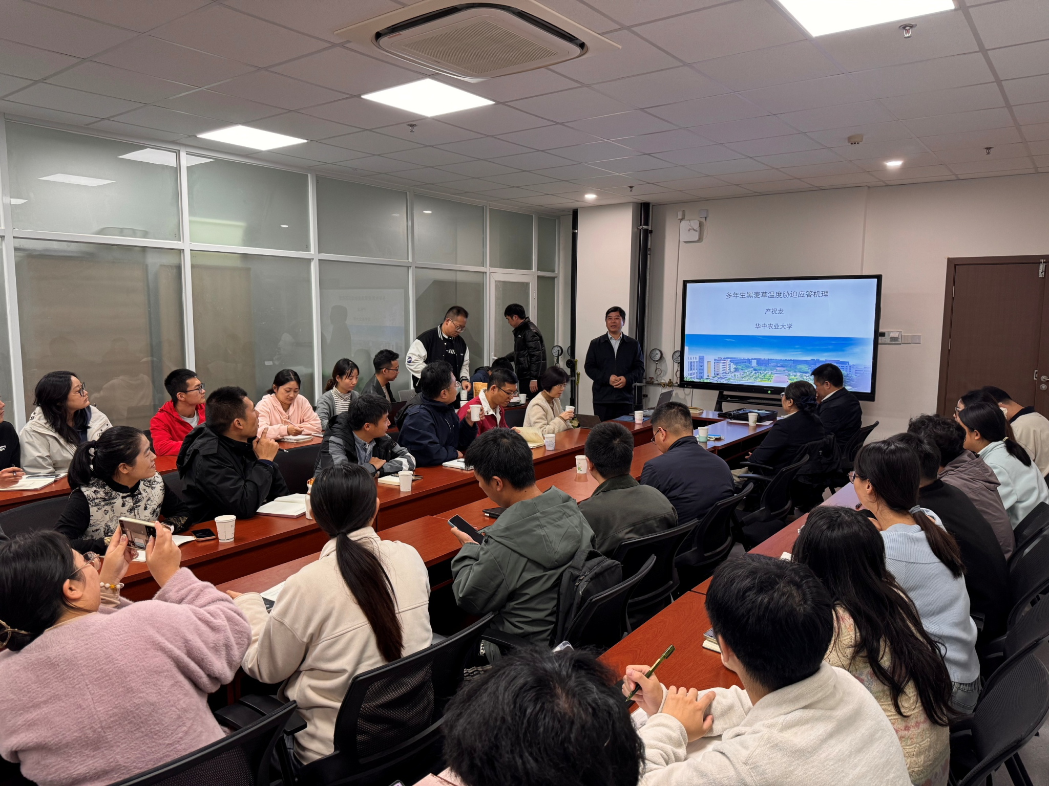 报告会上,三位专家分别围绕各自的研究领域,分享了草业科学的前沿成果。产祝龙教授以《多年生黑麦草应答温度胁迫机理》为题,从分子层面深入剖析了禾草应对逆境的复杂生物学机制,为草类植物抗性育种提供了重要的理论依据。孙彦教授的报告《低养护草坪兼生态草—野牛草的研究及应用》,则聚焦于可持续发展的生态理念,系统介绍了野牛草在低养护草坪建设中的巨大潜力和应用前景,为美丽中国建设提供了绿色方案。胡涛教授以《牧草基因编辑种质创新研究》为主题,展示了前沿的基因编辑技术在牧草种质创新和产量提升中的革命性应用。